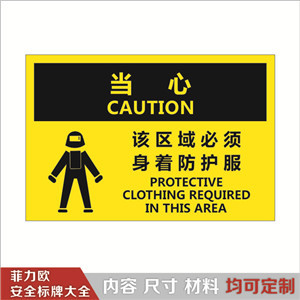 个人防护提示标识-当心-该区域必须身着防护服A12075